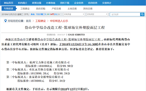 2018年12月6號中標(biāo)岱山中學(xué)室外籃球場塑膠面層改造工程公示