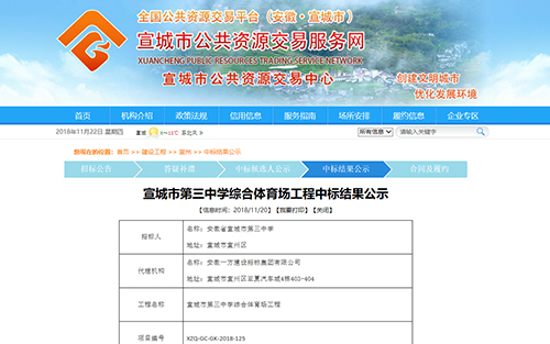 2018年11月20日中標(biāo)宣城市第三中學(xué)綜合體育場建設(shè)工程公告