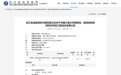 2018年6月5日中標(biāo)中國計(jì)量大學(xué)網(wǎng)球場、籃排球場和球場燈改造工程公告