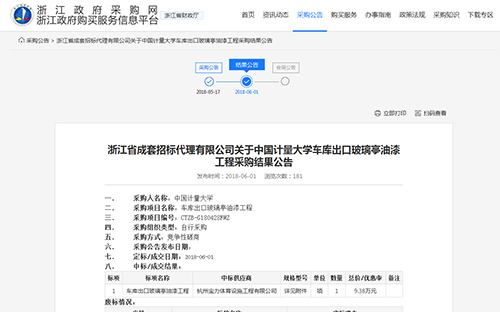 2018年6月1日中標(biāo)中國計(jì)量大學(xué)車庫出口玻璃亭油漆工程公告