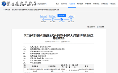 2018年7月18日中標(biāo)浙江中醫(yī)藥大學(xué)籃球場,排球場改造施工項(xiàng)目公告