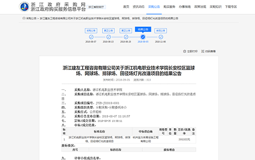 2018年9月5日中標(biāo)浙江機(jī)電職業(yè)技術(shù)學(xué)院長安校區(qū)籃球場,網(wǎng)球場,排球場,田徑場燈光改造項(xiàng)目公告